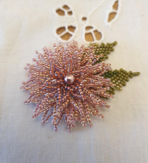Ma première broche, commande d’une amie. J’ai utilisé un tamis. Les finitions sont comme celles d’un brodé.