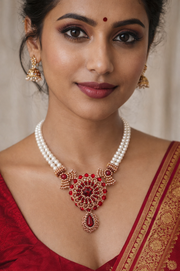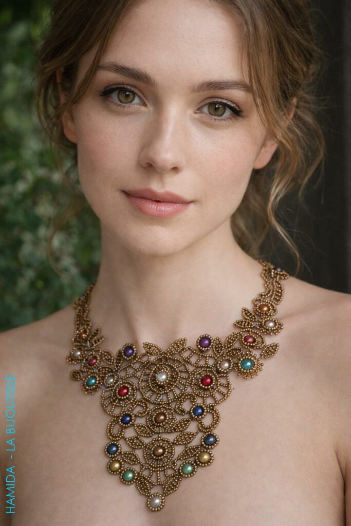 J’avais proposé à Hamida l’aventure d’un bijou à 4 mains. Je lui ai envoyé les schémas de plusieurs petits éléments. Elle a créé et perlé le centre du collier, me l’a envoyé et j’ai imaginé et perlé les côtés. Comme elle avait créé l’essentiel, elle a conservé le collier. Voici le résultat :